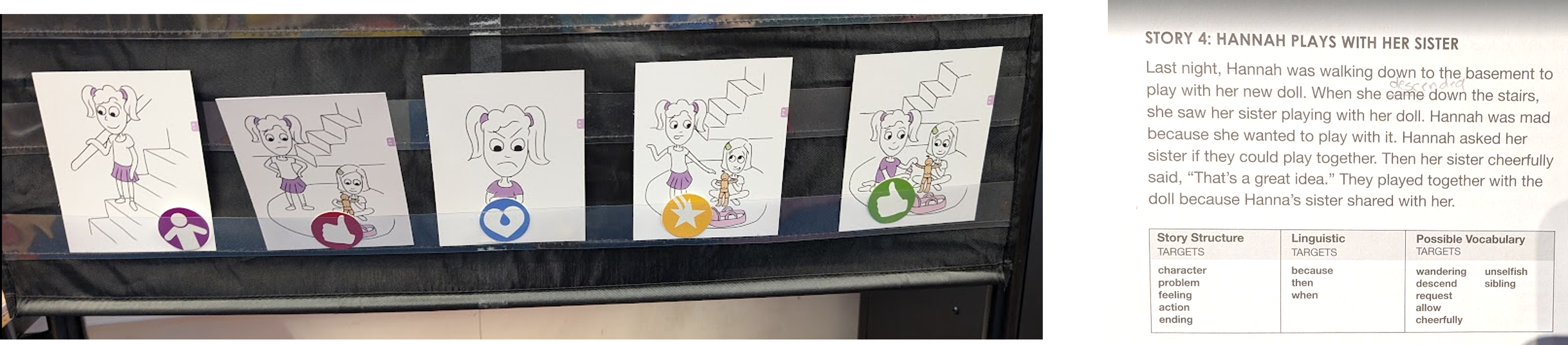 The “starter” stories in their program are very simple with only 5-6 sentences. Stories are accompanied by basic visuals, as shown in the image below. Teachers read the stories out loud and students identify story elements (problem, setting, etc.). Students then pair up and retell the story. Since it’s delivered orally, the teacher can swap in target vocabulary words as needed and there are multiple versions of the stories that vary in complexity and can be used to target various language structures.