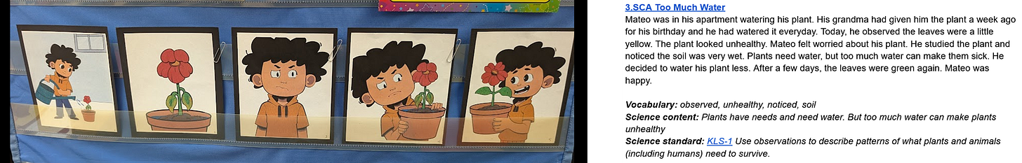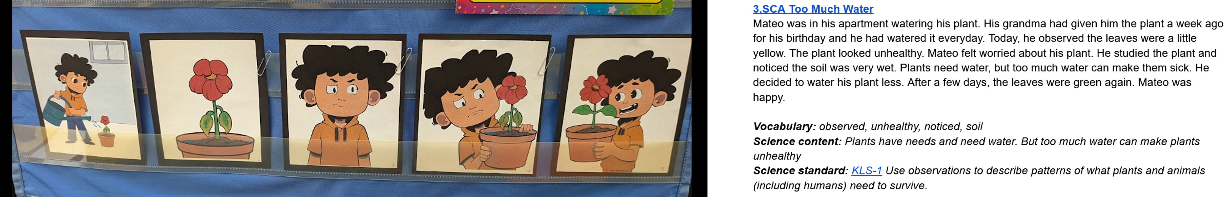 Story example 2: A boy has a special plant that starts to look unhealthy. He realizes he’s been watering it too much. Plants need water, but they can get too much water too! Taught during a kindergarten unit on plants’ needs.